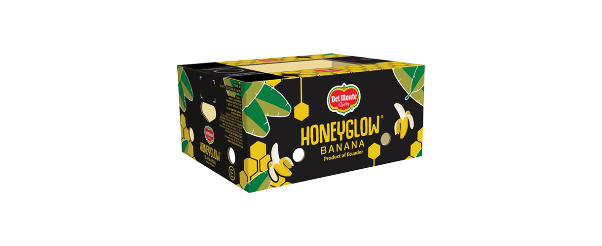 En vente chez les primeurs haut de gamme, les bananes Del Monte Honeyglow® sont reconnaissables à leur carton et étiquette noire et jaune "alvéoles nid d'abeilles".
