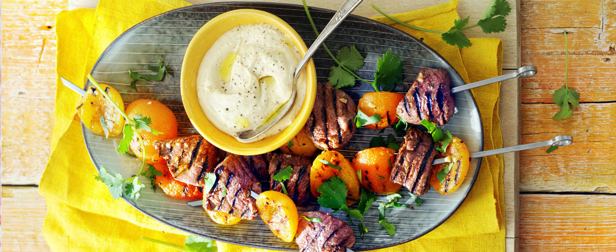Brochettes de bœuf, abricots & coriandre accompagné d’houmous